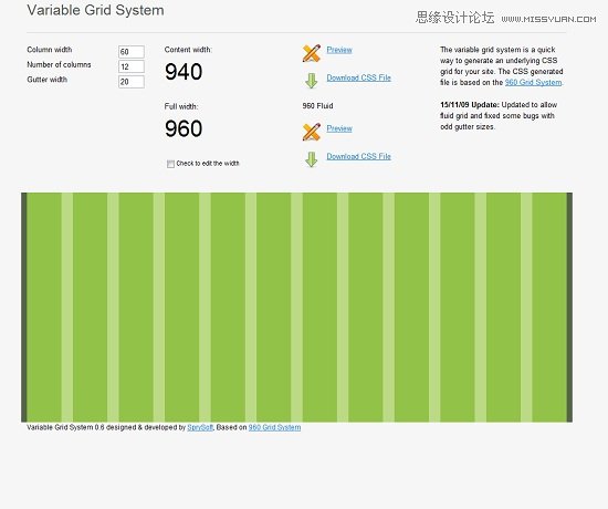 Variable Grid System依據960柵格系統,能夠自動產生布局,在精確調整后,提供CSS文件下載。