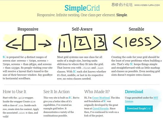 Simple Grid是難以置信的CSS框架,無所限制的柵格布局,支持不同大小的屏幕。